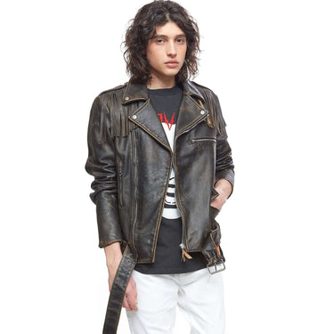 Black leather jacket. Asymmetric zip closure. removable fringes on the shoulders. Side pocket with zip closure. Zippers on the sleeves. 100% leather. Lining 100% viscose. Made in Italy.