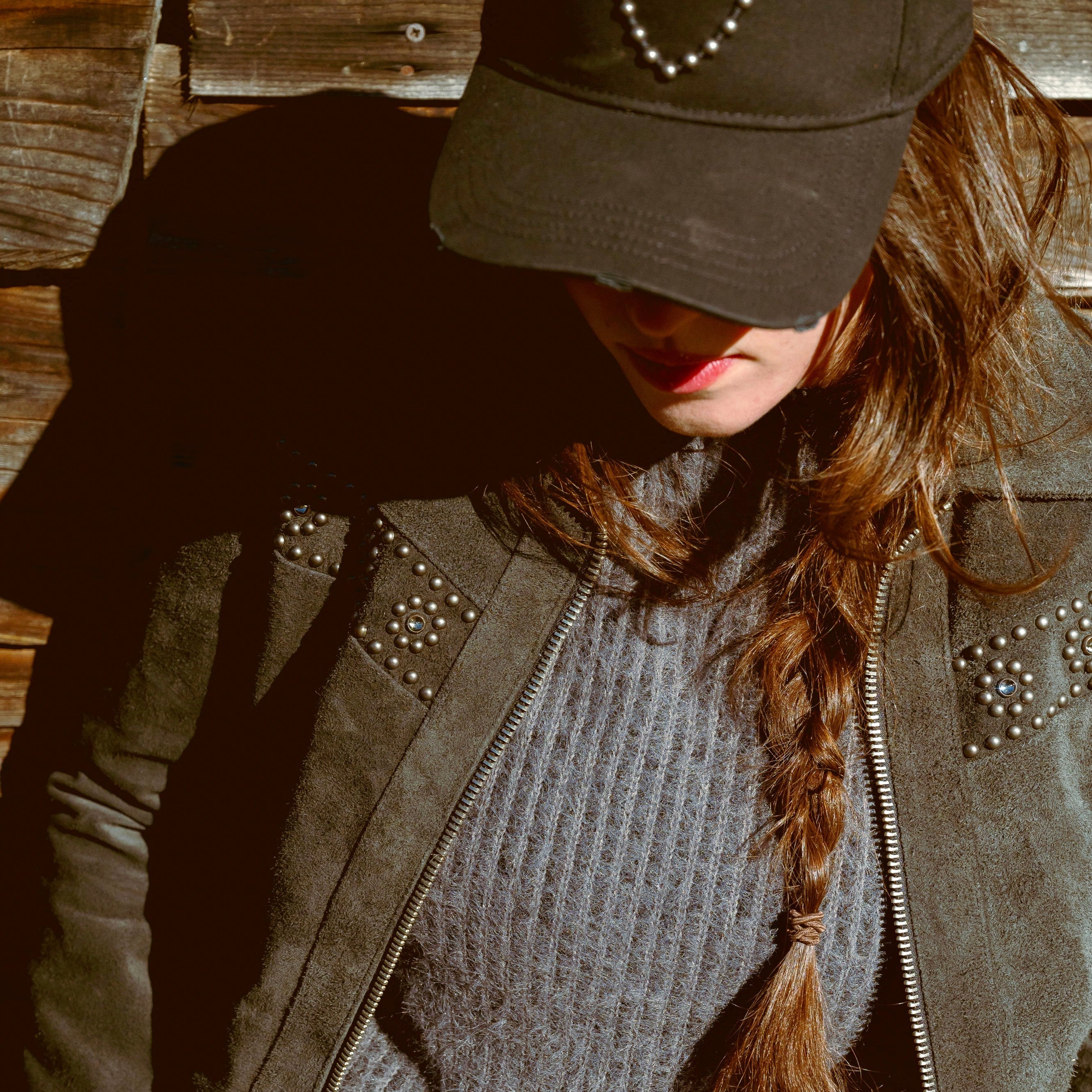 Dark Chocolate Suede Woman Jacket featuring floral studded details on the front.