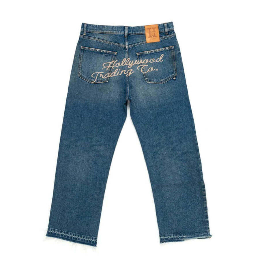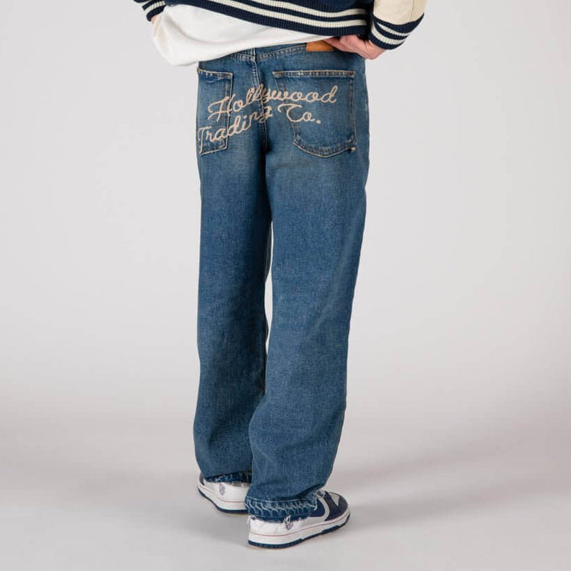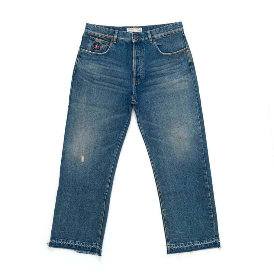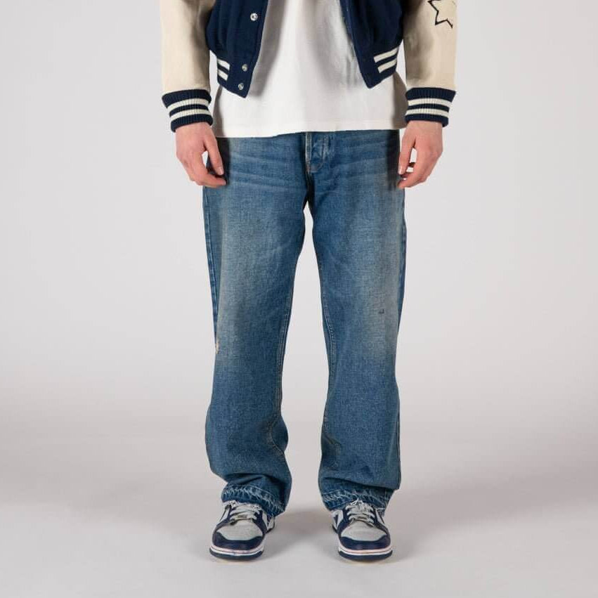 Loose fit jeans with front button and zip closure.