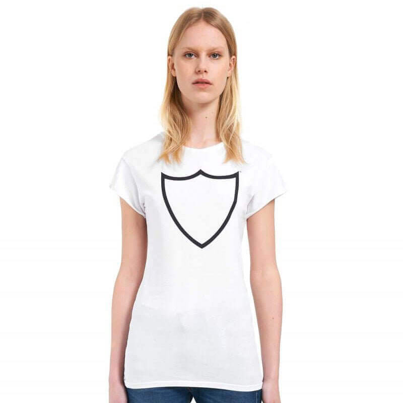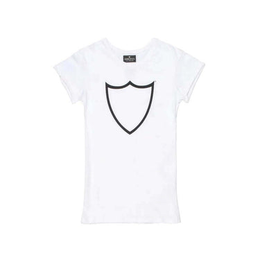 White cotton t-shirt with black HTC Los Angeles shield logo printed on the front.