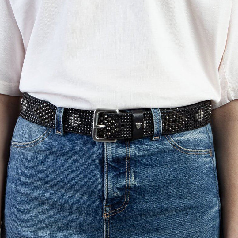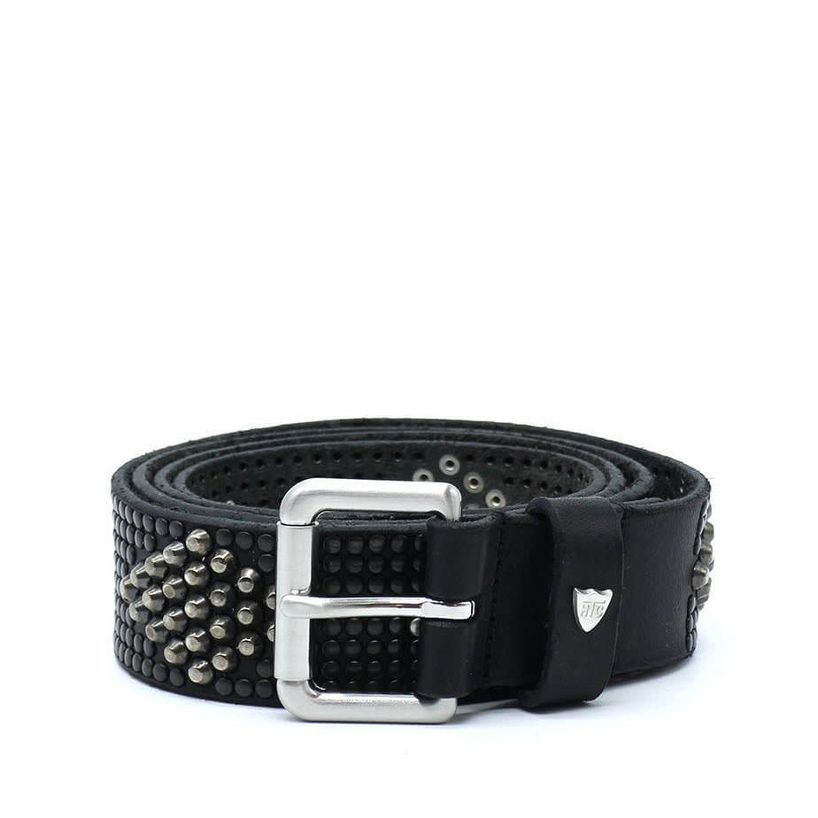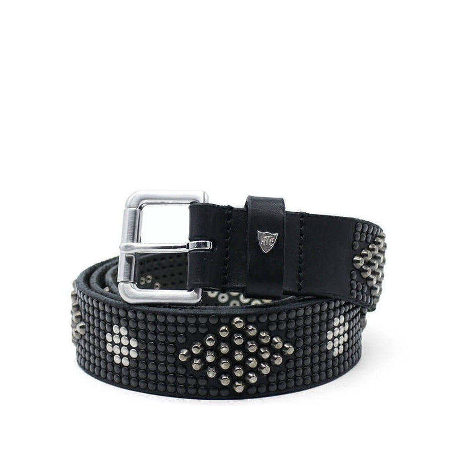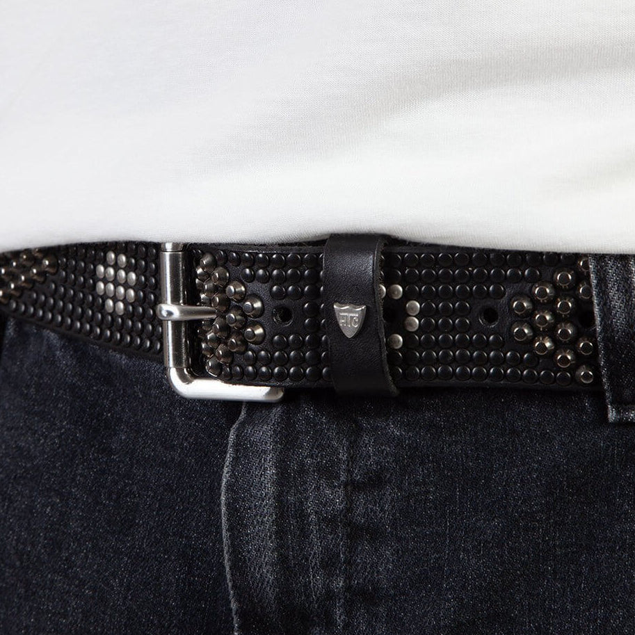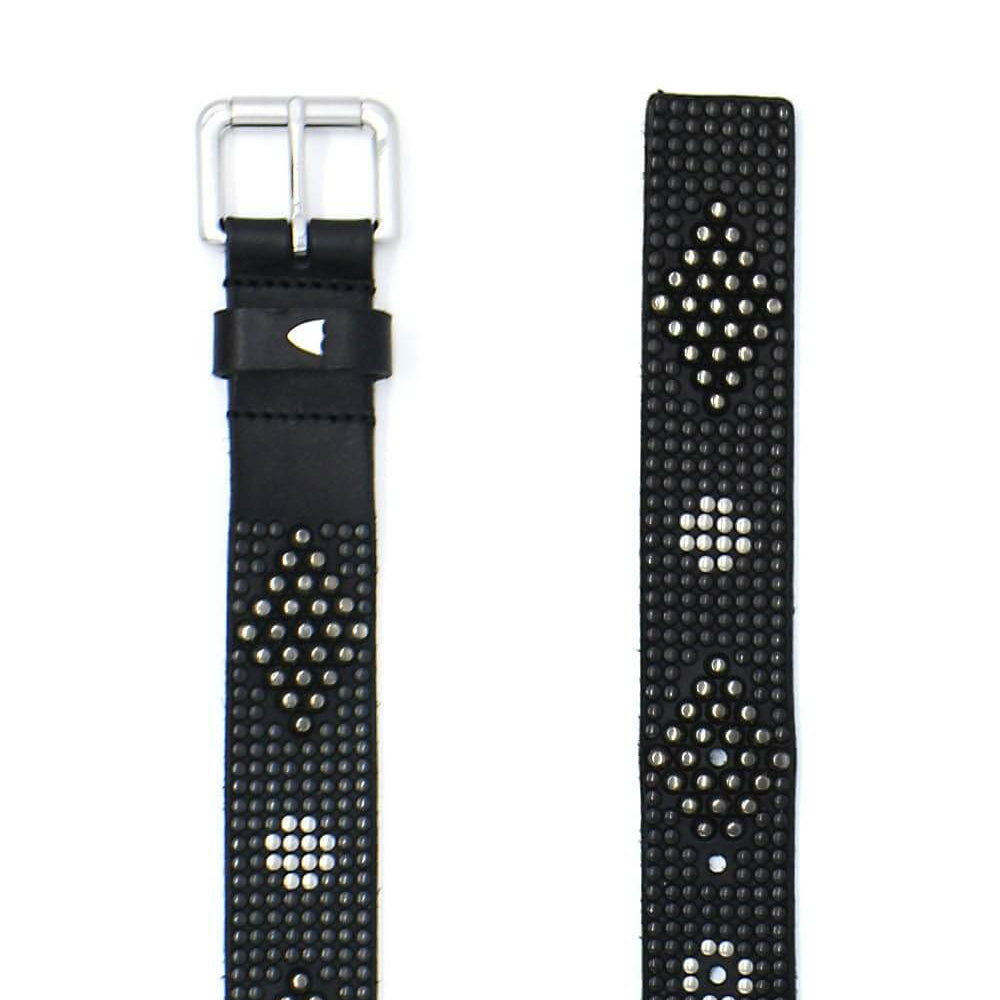 Black leather belt with mixed studs.