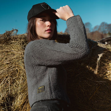 Dark Grey Ribbed sweater featuring a textured knit design and a boxy fit.